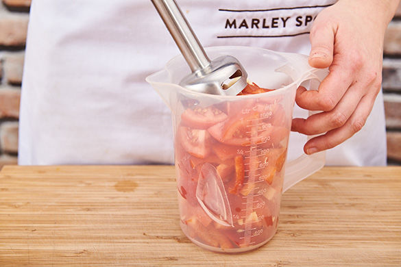 Die Tomaten vierteln, den Strunk entfernen. Die Paprika vierteln, das Kerngehäuse entfernen und nochmals halbieren. Den Knoblauch schälen. Alles zusammen mit einem Stabmixer fein pürieren.