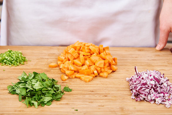 Die Zwiebel und die Karotten schälen und in möglichst kleine Würfel schneiden. Den Koriander von den Stielen zupfen. Die Stiele und die Blätter seperat grob hacken.