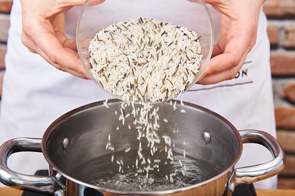 800ml Wasser im Topf zum Kochen bringen. Den Reis in einem Sieb unter fließendem Wasser solange abspülen, bis das Wasser klar bleibt. Sobald das Wasser kocht, Reis mit einer Prise Salz in den Topf geben, zum Kochen bringen und dann bei niedrigster Hitze mit einem Deckel ca. 10-12Min. bissfest kochen. Schließlich ca. 5Min. ohne Hitze ziehen lassen.