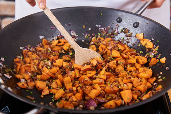 Inzwischen in einer großen Pfanne 1EL Öl mittelhoch erhitzen, darin die Zwiebeln, Korianderstiele und Karotten ca. 4-6Min. braten, bis sie weich und leicht gebräunt sind. Mit Salz und Pfeffer würzen.