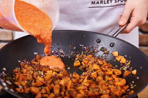 Nun das Ras el Hanout zum Gemüse geben und ca. 1Min. mitdünsten. Das Paprikapüree hinzugeben und alles ca. 8-10Min. einköcheln, bis die Sauce etwas angedickt ist.