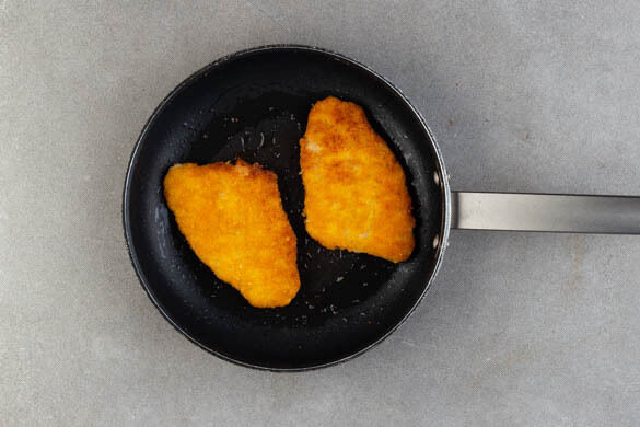 3EL Pflanzenöl in einer großen Pfanne mittelhoch erhitzen. Die Schnitzel bei mittlerer Hitze 3–4Min. von jeder Seite braten, bis sie warm und knusprig sind.