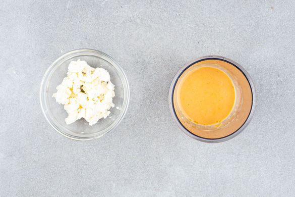 Die Tomatenkerne mit 1EL körnigem Senf, 2EL Olivenöl und 1EL Balsamicoessig mit einem Stabmixer fein pürieren. Mit Salz und Pfeffer abschmecken. Den Käse mit den Fingern oder einer Gabel zerkrümeln.
