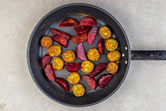 Die Falafeln und die Rote Bete mit 2EL Olivenöl in einer mittelgroßen Pfanne bei mittlerer Hitze in 4–5Min. rundum goldbraun braten. Mit der restlichen Gewürzmischung würzen und aus der Pfanne nehmen.