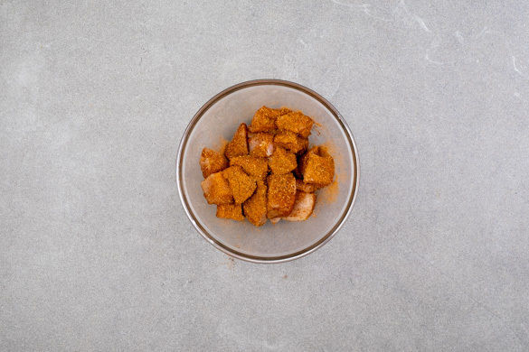 Das Fleisch trocken tupfen, in mundgerechte Stücke schneiden und mit der Gewürzmischung vermengen.