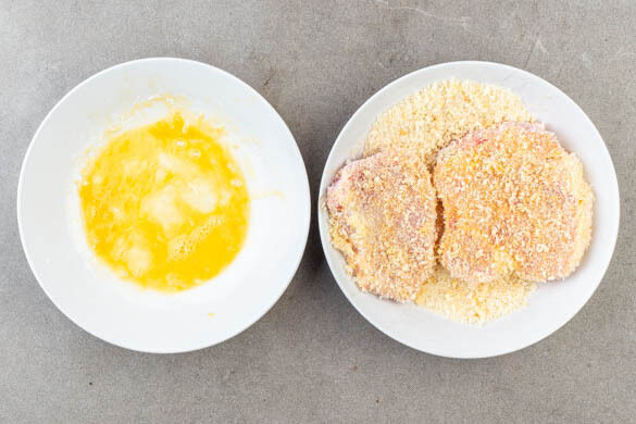 Auf einem tiefen Teller 1 Ei verquirlen. Das Paniermehl auf einen zweiten Teller geben. Das Fleisch trocken tupfen und mit je 1 kräftigen Prise Salz und Pfeffer würzen, dann mit 2EL Mehl bestäuben. Überschüssiges Mehl abschütteln, dann das Fleisch im Ei und zum Schluss im Paniermehl wenden. Die Panade ggf. noch leicht andrücken.