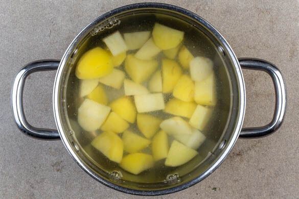 In einem mittelgroßen Topf ausreichend gesalzenes Wasser für die Kartoffeln zum Kochen bringen. Die Kartoffeln schälen und in mundgerechte Stücke schneiden, dann in das kochende Wasser geben und in 15–20Min. gar kochen. In ein Sieb abgießen und mit Salz und Pfeffer abschmecken.
