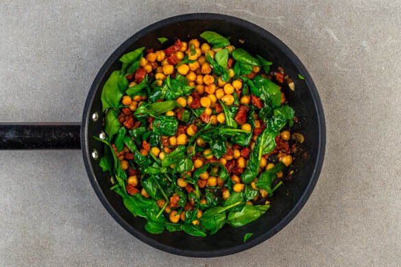 Die Kichererbsen, den Knoblauch und das Paprikapulver auf die Pfannen verteilen, mit der Chorizo vermengen und in 2–3Min. duftend anbraten. Die ½ des Spinats auf die Pfannen verteilen, untermischen und bei mittlerer Hitze garen, bis der Spinat leicht zusammenfällt.