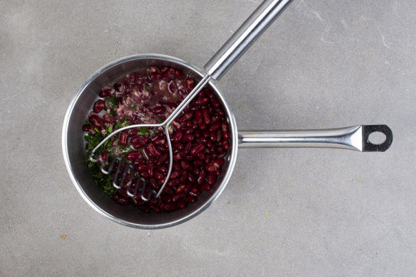Die Bohnen in ein Sieb abgießen, dabei die Flüssigkeit auffangen. Die Bohnen in einem kleinen Topf bei mittlerer Hitze 2–4Min. erwärmen, dann die ½ des restlichen Korianders und die ½ des Knoblauchs hinzugeben und alles grob zerstampfen. Etwas Bohnenflüssigkeit hinzugeben, bis eine dickliche Paste entsteht. Mit Salz und Pfeffer abschmecken.