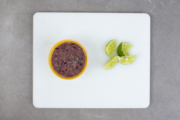 Die restliche Bohnenpaste mit 2–3EL Bohnenflüssigkeit verrühren, bis ein cremiger Dip entsteht. Die Limette halbieren, eine Hälfte auspressen, die andere Hälfte in Spalten schneiden. Den Dip mit Limettensaft abschmecken. Die Quesadillas mit dem übrigen Koriander garnieren und mit dem Dip, der Salsa und den Limettenspalten servieren.