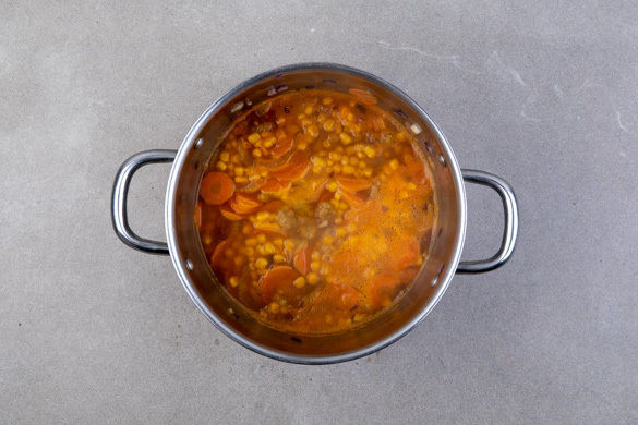 Die Karotten, den Sellerie und die Zwiebeln in einem mittelgroßen Topf mit 1EL Olivenöl und 1 Prise Salz bei mittlerer Hitze 2–3Min. anbraten. Den Knoblauch schälen und fein würfeln, dann mit dem Mais und der ½ des geräucherten Paprikapulvers oder nach Geschmack mehr ebenfalls in den Topf geben und 3–4Min. mitbraten.