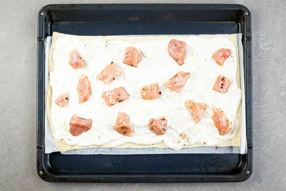 Die Teige mit dem Papier nach unten auf zwei Backblechen ausrollen und gleichmäßig mit der Limettencreme bestreichen. Die Schnetzel darauf verteilen und die Flammkuchen 10–12Min. im Ofen backen. Je nach Ofen die Position der Bleche nach der Hälfte der Zeit tauschen.