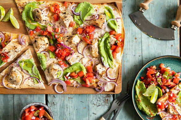 Hast du Lust auf etwas Neues? Dann probiere doch mal diesen Flammkuchen auf mexikanische Art! Er wird mit einer erfrischenden limettigen Creme bestrichen, mit den leckeren veganen Hähnchenschnetzeln von Heura belegt und vor dem Servieren mit Guacamole, Zwiebeln und einer würzigen Tomaten-Peperoni-Salsa garniert. Du wirst begeistert sein!