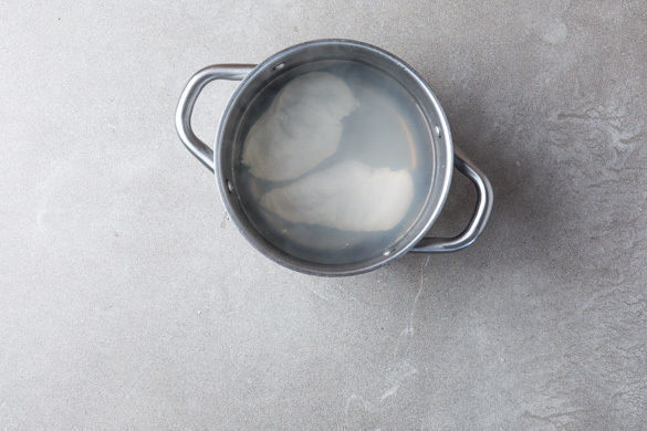 Den Backofen auf 220°C (200°C Umluft) vorheizen. In einem mittelgroßen Topf ausreichend gesalzenes Wasser für das Fleisch zum Kochen bringen. Das Fleisch trocken tupfen und längs halbieren. In das kochende Wasser geben und 10–12Min. sanft kochen lassen, dann in ein Sieb abgießen.