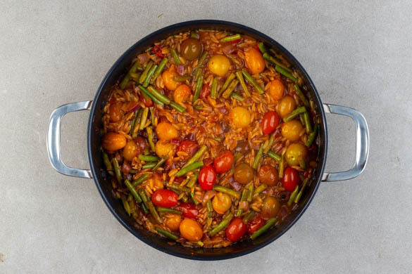 Das Gemüse mit 1EL Essig ablöschen und die Risoni, die Kirschtomaten und die Oliven untermengen. 500ml Wasser und die ½ des Brühgewürzes unterrühren und die Flüssigkeit aufkochen lassen.
