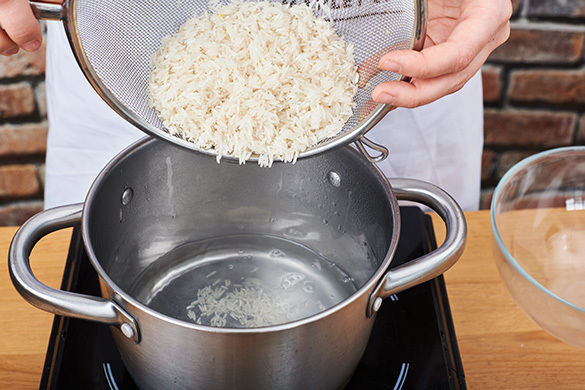 In einem kleinen Topf 300ml leicht gesalzenes Wasser zum Kochen bringen. Den Reis in einem Sieb kalt abspülen, bis das Wasser klar bleibt. Sobald das Wasser kocht, den Reis hineingeben und abgedeckt bei niedrigster Hitze 8–10Min. kochen, bis das Wasser aufgesogen und der Reis gar ist. Noch ca. 5Min. ohne Hitzezufuhr ziehen lassen.