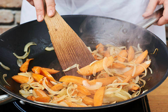 Die Zwiebeln in einer großen Pfanne mit 1EL Pflanzenöl bei mittlerer Hitze 2–3Min. anbraten. Die Karotten dazugeben und 3–5Min. mitbraten, dann die Gewürzmischung und den Ingwer unterrühren. Die Kokosmilch, 200–300ml Wasser und das Brühgewürz unterrühren. Die Temperatur reduzieren und das Curry 2–3Min. sanft köcheln lassen.