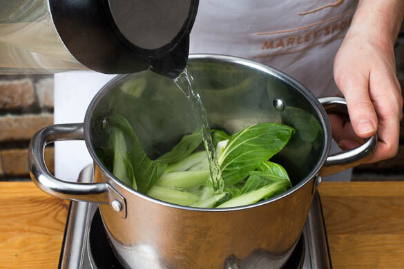 Den Pak Choi in einen mittelgroßen Topf geben, mit dem kochenden Wasser übergießen und bei mittlerer Hitze 1–2Min. kochen. In ein Sieb abgießen und abtropfen lassen.