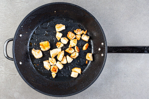 Die veganen Schnetzel mit ½TL Salz würzen und in einer mittelgroßen Pfanne mit 1EL Pflanzenöl bei mittlerer Hitze in 6–7Min. rundum goldbraun braten. Die Schnetzel aus der Pfanne nehmen und beiseitestellen, die Pfanne nicht auswischen.