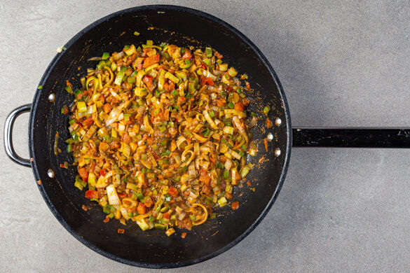 Den Lauch längs halbieren und quer in feine Streifen schneiden. Die Tomate in kleine Würfel schneiden. Die Paprika vierteln, entkernen und ebenfalls in kleine Würfel schneiden. Den Lauch, die Tomaten und ⅔ der Paprika in derselben Pfanne bei mittlerer Hitze ca. 3Min. anbraten. Die Currypaste hinzugeben und bei niedriger Hitze ca. 1Min. mitbraten.