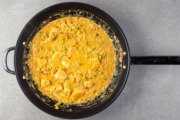 Tikka-Masala-Hähnchen wurde im Jahr 2001 zum beliebtesten Gericht Großbritanniens gekürt. Großbritanniens? Genau, denn die traditionelle indische Zubereitung wurde mit einer Sauce aus Tomaten, Sahne und Masalagewürz bereichert, um den englischen Essgewohnheiten entgegenzukommen. Wir finden, dass unsere vegetarische Variante mit den veganen Hähnchenschnetzeln von Heura, Lauch und Paprika-Dattel-Creme noch besser mundet!