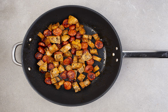 Die Chorizo in feine Scheiben schneiden oder grob würfeln.