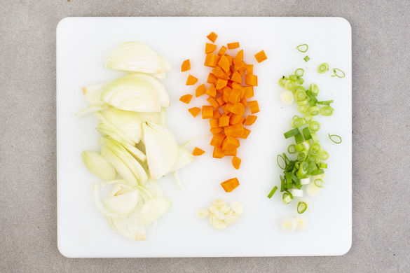 Die Karotte schälen, längs vierteln und in kleine Würfel schneiden. Die Zwiebeln schälen, halbieren und in feine Streifen schneiden. Den Knoblauch schälen und in dünne Scheibchen schneiden. Die Lauchzwiebel in feine Ringe schneiden.