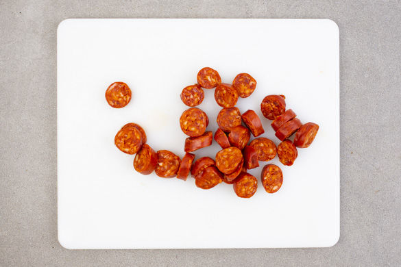 Die Chorizo in feine Scheiben schneiden oder grob würfeln.