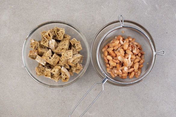 Das Brot in kleine Würfel schneiden. Die Bohnen in ein Sieb abgießen, dabei das Bohnenwasser auffangen.