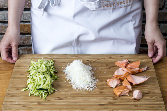 Die Zucchini mit einer Küchenreibe grob raspeln, leicht salzen und mit den Händen oder in einem Tuch gut auswringen. Den Käse fein reiben. Mit einem scharfen Messer die Haut vom Lachs entfernen und den Lachs mit einer Gabel oder den Fingern in mundgerechte Stücke zerteilen. Evtl. vorhandene Gräten mit einer Pinzette entfernen.