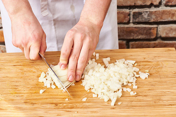 Die Zwiebeln schälen, halbieren und in feine Würfel schneiden.