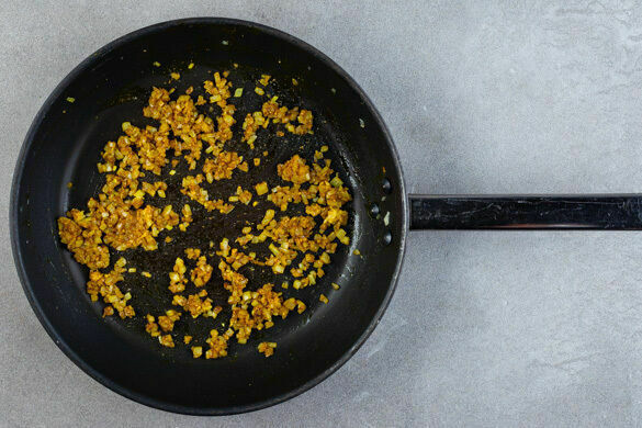 Die Zwiebeln in einer großen Pfanne mit 1EL Olivenöl bei mittlerer Hitze ca. 2Min. glasig andünsten. Das restliche Currypulver und den Knoblauch dazugeben und ca. 1Min. mitbraten.