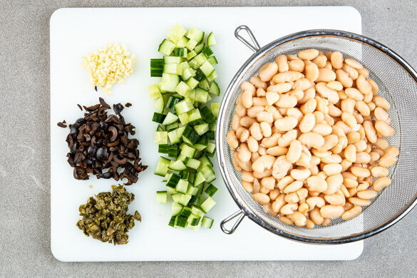 Die Bohnen in einem Sieb mit kaltem Wasser abspülen und abtropfen lassen. Den Knoblauch schälen und fein würfeln. Die Oliven und die Kapern fein schneiden. Die Gurke in ca. 2cm große Würfel schneiden.