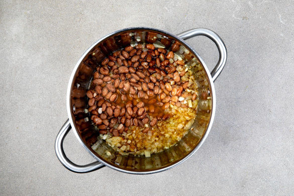 Die Bohnen in ein Sieb abgießen und in den Topf geben. Mit 300ml heißem Wasser aufgießen und ca. 5Min. sanft köcheln lassen. Anschließend abgießen, dabei ca. 1 Tasse Kochwasser auffangen. Währenddessen die Brötchen 4–6Min. im Ofen aufbacken.