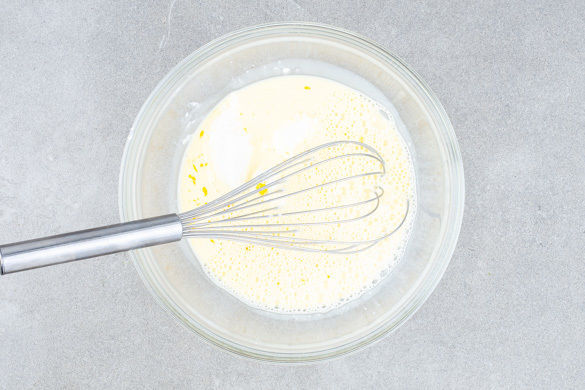 In einer zweiten Schüssel die Eier mit der Milch verquirlen und die 1/2 des Ricottas unterrühren. Der restliche Ricotta wird für dieses Rezept nicht benötigt.