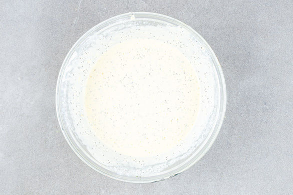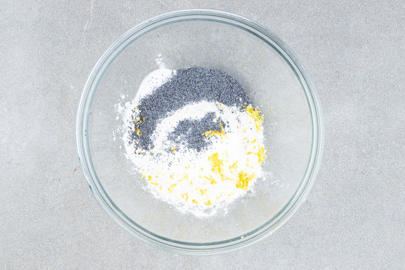 Die Zitronenschale abreiben, dann die Zitrone halbieren und auspressen. Den Zitronenabrieb mit dem Mehl, der 1/2 des Backpulvers, dem Mohn, 2EL Zucker und 1/4TL Salz vermengen.