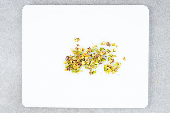 Die Pistazien grob hacken. Die Pancakes mit der Blaubeersauce und den Pistazien anrichten und servieren.