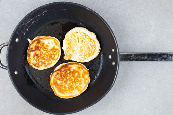 In einer großen Pfanne 1EL Pflanzenöl bei mittlerer Hitze erwärmen. Für jeden Pancake ca. 2EL Teig in die Pfanne geben und auf jeder Seite 3–4Min. anbraten. So fortfahren, bis der gesamte Teig aufgebraucht ist. Tipp: Wer mag, kann auch zwei Pfannen verwenden.