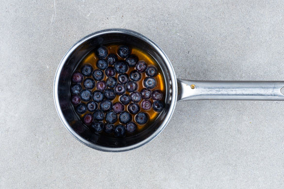 Die Blaubeeren mit dem Zitronensaft und dem Ahornsirup in einem kleinen Topf bei mittlerer bis starker Hitze 3–5Min. köcheln lassen, bis eine dickliche Sauce entsteht. Dabei einige der Blaubeeren mit dem Kochlöffel zerdrücken.