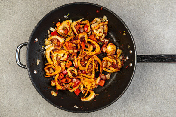 Den Fenchel, die Paprika und die Zwiebeln in einer mittelgroßen Pfanne mit 2EL Olivenöl und 1 kräftigen Prise Salz bei mittlerer Hitze 6–8Min. anbraten, bis das Gemüse weich wird, dabei gelegentlich umrühren.