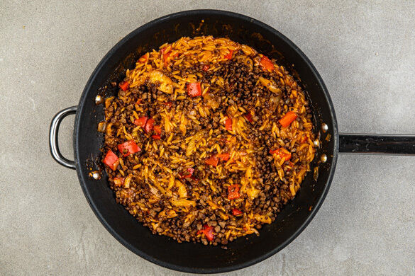 Dieses Gericht gleicht einem Zaubertrick, denn nichts ist so, wie es scheint: Was aussieht wie Reis, ist Pasta, was schmeckt wie Hackfleisch, ist vegan … Allein das Gemüse hält, was es verspricht: Aromatischer Fenchel harmoniert mit der würzigen Süße von gebratener Paprika und Zwiebeln, während Dill und Petersilie die tomatige Sauce abrunden, in der die Orzo-Nudeln köcheln. Da lassen wir uns doch gerne verzaubern!