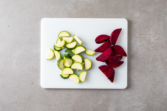 Den Backofen auf 220°C (200°C Umluft) vorheizen. Die Rote Bete halbieren und in ca. 0,5cm breite Spalten schneiden. Die Zucchini längs halbieren und quer in 0,5–1cm dicke Scheiben schneiden.
