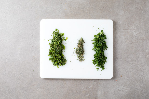 Die Thymianblätter von den Stängeln streifen und fein hacken. Die Petersilie samt Stängeln ebenfalls fein hacken.