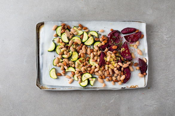 Die Bohnen in ein Sieb abgießen und mit der Roten Bete und der Zucchini auf ein mit Backpapier ausgelegtes Backblech geben. Mit 2EL Olivenöl und je 1 kräftigen Prise Salz und Pfeffer vermengen und das Gemüse 15–20Min. im Ofen rösten, bis es leicht gebräunt ist.