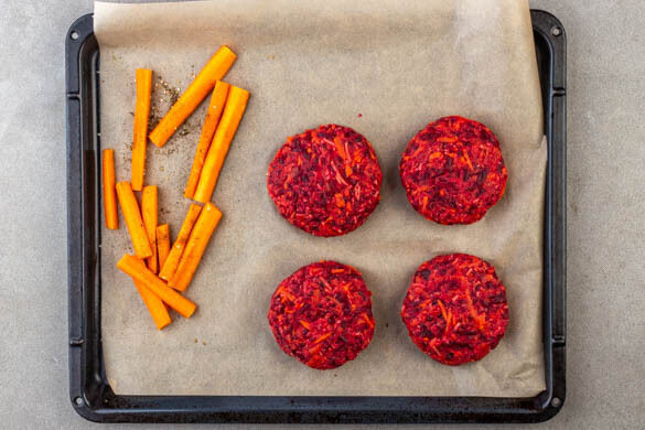 Insgesamt 8 Pattys formen, auf ein mit Backpapier ausgelegtes Backblech geben und mit 2EL Olivenöl beträufeln. 2 Karotten schälen und grob reiben. Die übrigen Karotten schälen, in pommesartige, ca. 2cm dicke Stifte schneiden und mit der ½ der Gewürzmischung, 2TL Olivenöl und je 1 kräftigen Prise Salz und Pfeffer vermengen. Auf ein zweites Blech geben und alles ca. 20Min. backen.