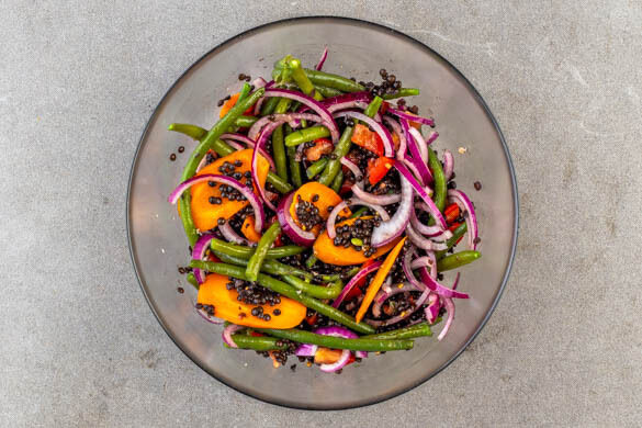 Die Involtini schräg halbieren und austretenden Fleischsaft mit den Karotten, den Bohnen, den Zwiebeln und den Tomaten unter die Linsen mengen. Das Linsen-Gemüse mit je 2EL Olivenöl und Essig, 1TL Honig sowie Salz und Pfeffer abschmecken. Die Involtini darauf anrichten, mit dem Petersilienöl garnieren und servieren.
