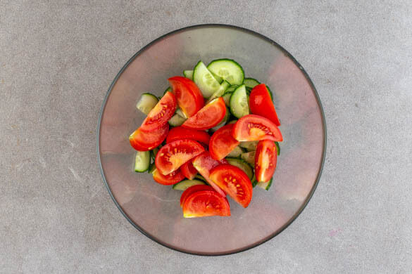 Die Gurke in dünne Scheiben schneiden. Die Tomaten in ca. 2cm große Stücke schneiden. Die Gurken und die Tomaten mit 1TL hellem Essig und 1 Prise Salz würzen.
