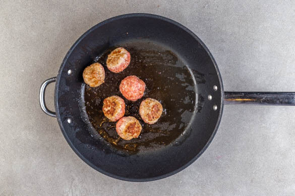 Die Hackbällchen in einer mittelgroßen Pfanne mit 1TL Pflanzenöl bei mittlerer Hitze auf jeder Seite 2–3Min. anbraten. Dann weitere 3–4Min. abgedeckt weiterbraten, bis die Hackbällchen durch sind.