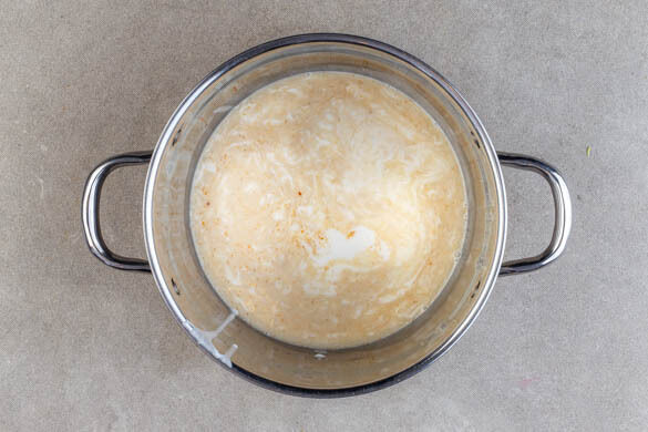 In einem mittelgroßen Topf die Kokosmilch, 200ml Wasser, die ½ der Gewürzmischung und ½TL Salz zum Kochen bringen.