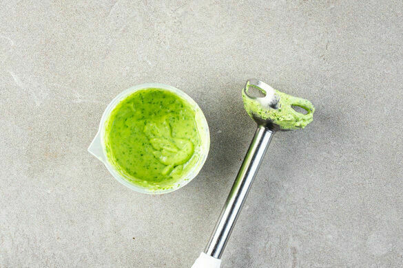 Den Knoblauch schälen, grob würfeln und mit dem Feta, dem Basilikum samt Stängeln, 2EL hellem Essig, 2–3EL Wasser sowie 1 kräftigen Prise Pfeffer in einem hohen Gefäß zu einer glatten Creme pürieren. Nach Geschmack mit mehr Essig, Salz oder Pfeffer verfeinern.